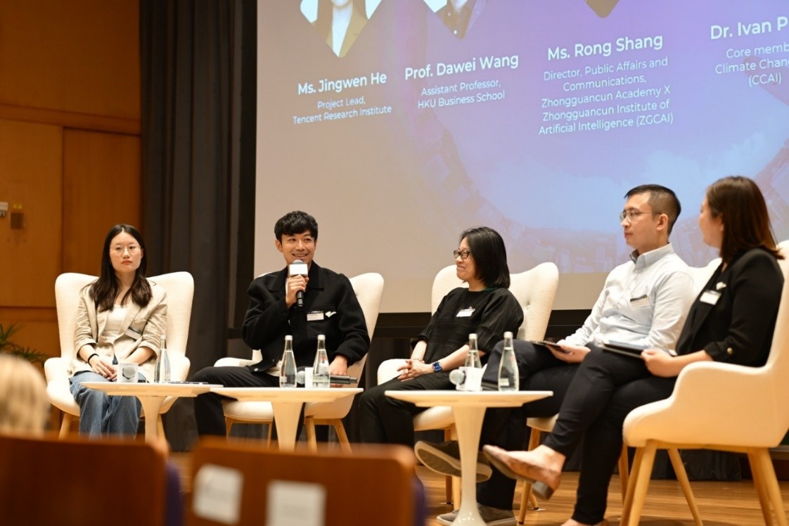 From right: Ms. Bernice YU, Head of Operations of HKU Jockey Club Enterprise Sustainability Global Research Institute; Dr. Ivan POON, core member at Climate Change AI (CCAI); Ms. Rong SHANG, Director, Public Affairs and Communications, Zhongguancun Academy X Zhongguancun Institute of Artificial Intelligence (ZGCAI); Prof. Dawei WANG, Assistant Professor, HKU Business School; and Ms. Jingwen HE, Project Manager, Tencent Research Institute, joined the Roundtable Dialogue on AI for Sustainability.