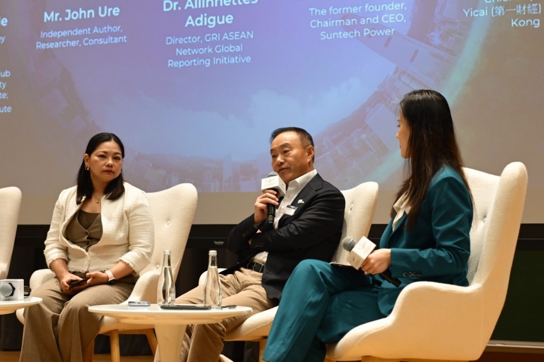 From right: Ms. Hang YU, Chief Reporter of Yicai (第一財經) in Hong Kong; Dr. Zhengrong SHI, the former founder, Chairman and Chief Executive Officer of Suntech Power; Dr. Allinnettes ADIGUE, Director, GRI ASEAN Network Global Reporting Initiative, joined the Roundtable Dialogue on ESG: Consensus, Critique, and Course-Correction.