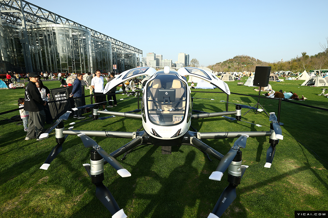 The picture shows an eVTOL aircraft from Chinese drone manufacturer EHang Holdings on display at the festival, with its cockpit open for visitors to observe.