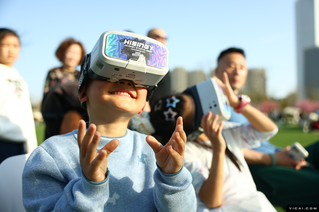 A young child experiences drone flight from a first-person perspective using a headset display.