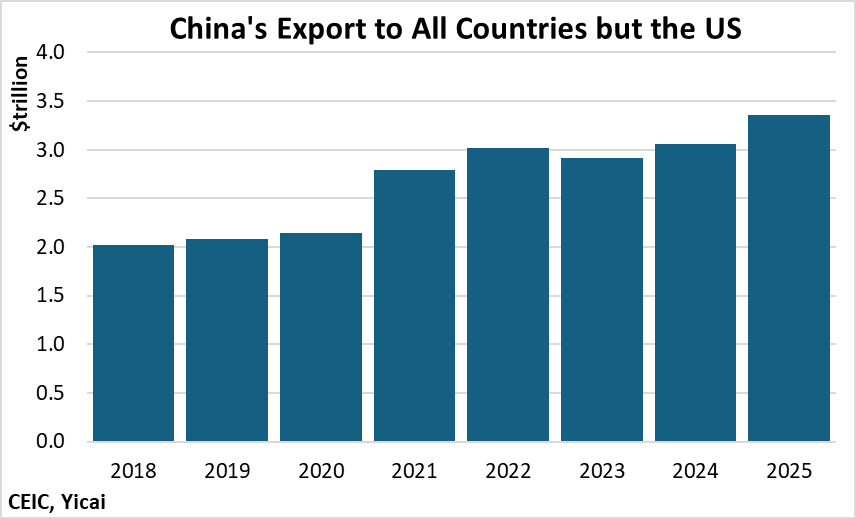 It does not seem that countries other than the US have become saturated with Chinese goods. Between 2018 and 2024, China’s exports to these countries rose by 7 percent per year. Last year, they rose by 10 percent (Figure 2).