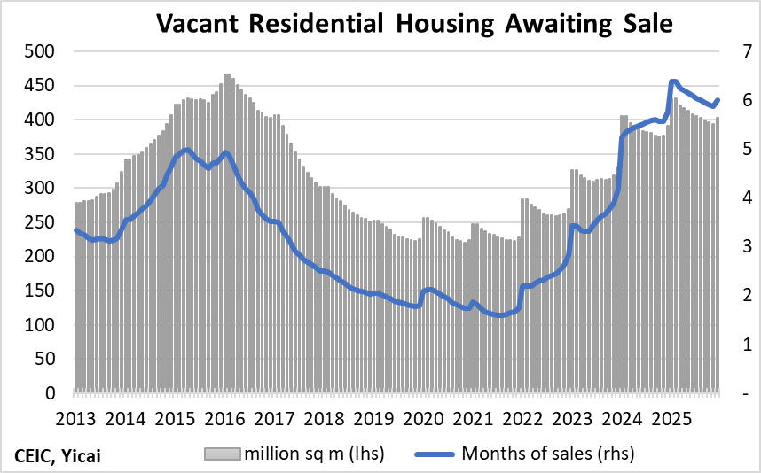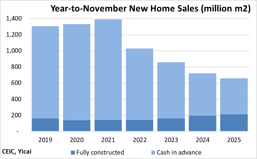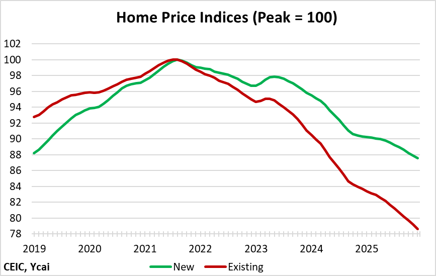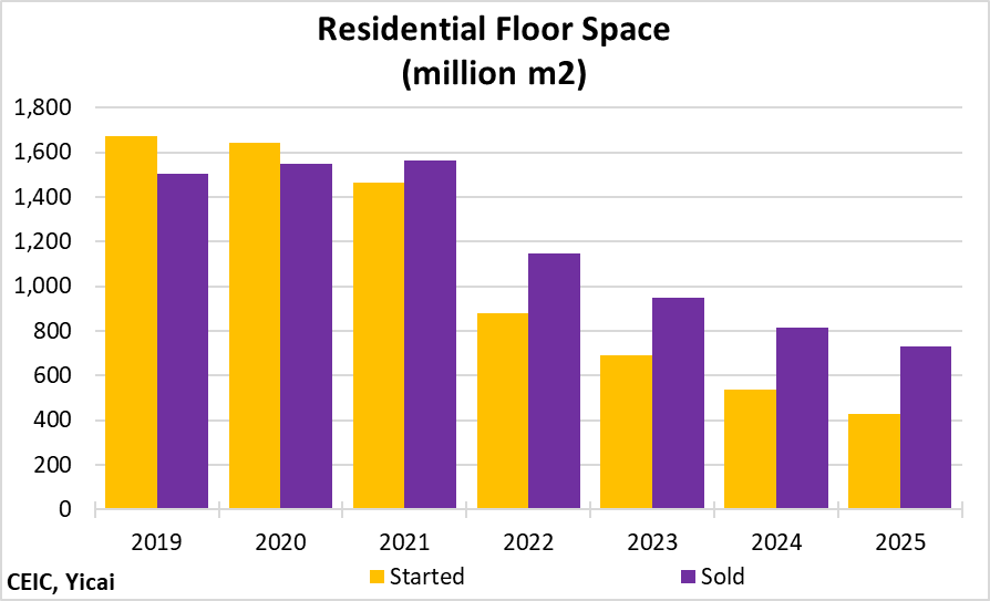 The correction in the housing market shows no sign of bottoming out. In 2025, the volume of residential floor space sold fell by 10 percent to 733 million square meters. This is less than half the amount sold, on average, in 2019-21 (Figure 3). The correction in the volume of housing starts was even more precipitous, down 20 percent year-over-year. At 430 million square meters, starts last year were only 27 percent of the 2019-21 average.