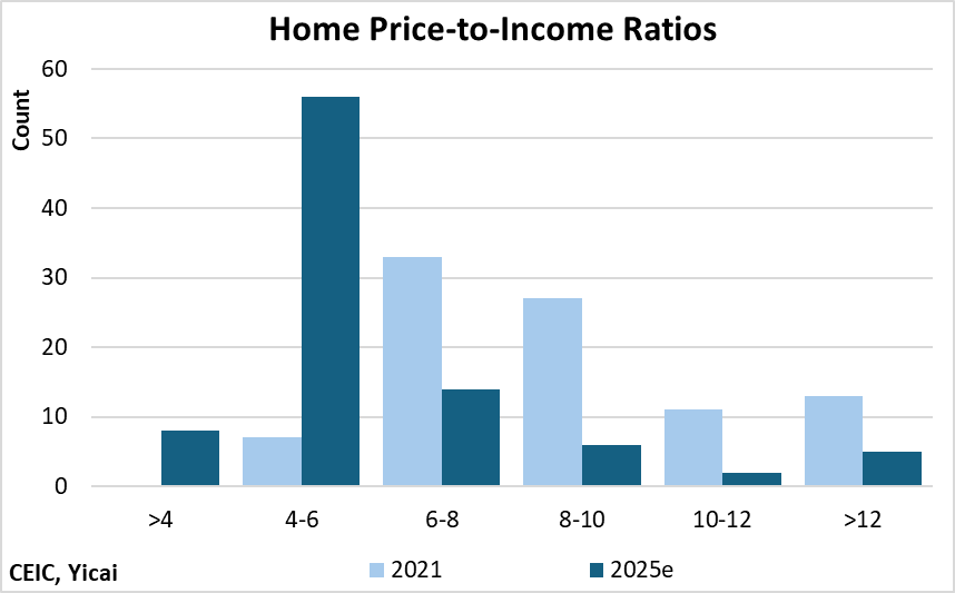 There is a silver lining to the correction in the property market: housing has become more affordable. Looking across 91 cities, the median home-price-to-household income ratio fell from 8.6 in 2021 to 5.3 in 2025 (Figure 7). While there still are 7 Chinese cities in which the price-to-household income-ratio exceeds 10, that’s down from 24 cities in 2021.