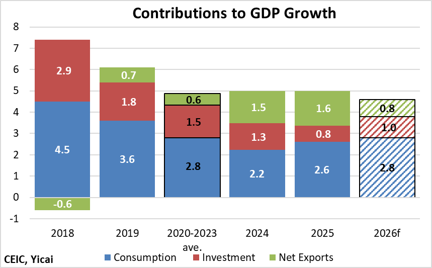 Given the competitiveness of China’s manufacturing sector, I believe that net exports will make a positive, albeit somewhat smaller, contribution to growth in 2026.