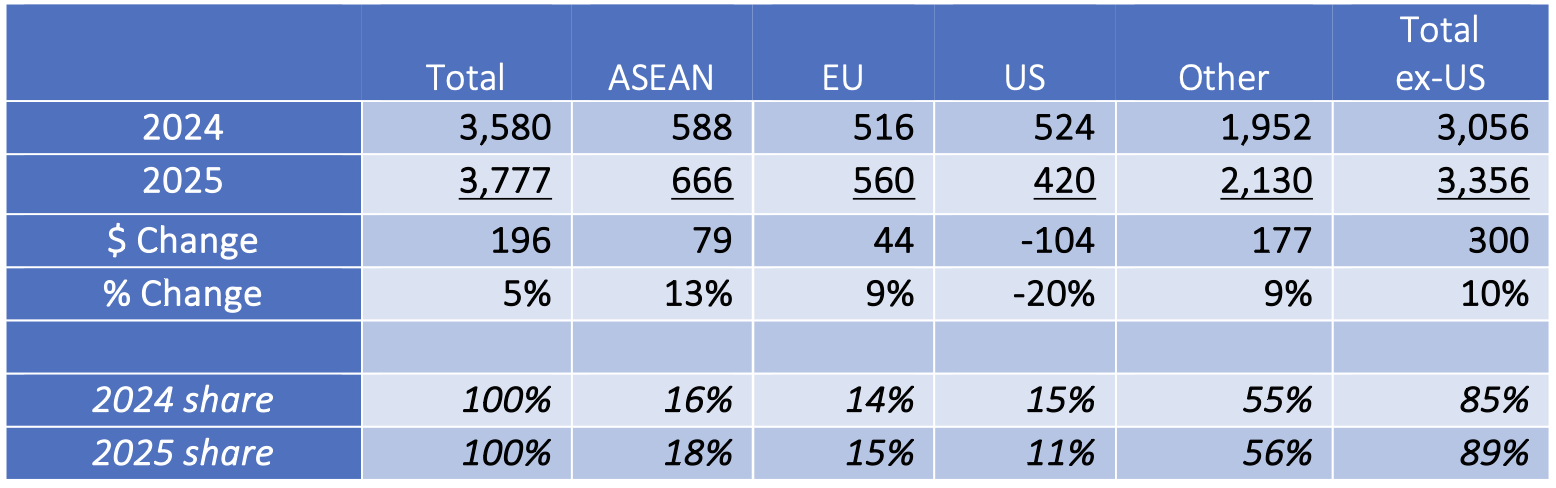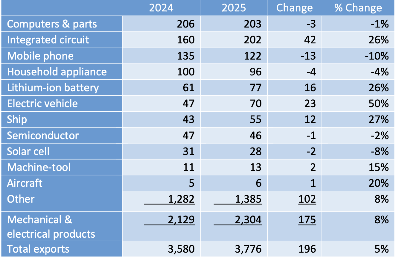 Moreover, China’s product array keeps changing. Because of its manufacturing prowess, China’s exports can pivot in respect to changing demand patterns. For example, in 2025, demand for consumer goods – mobile phones, computers and household appliances – was weak and sales of these products fell (Table 2). But the demand for producer goods – integrated circuits and lithium ion batteries –