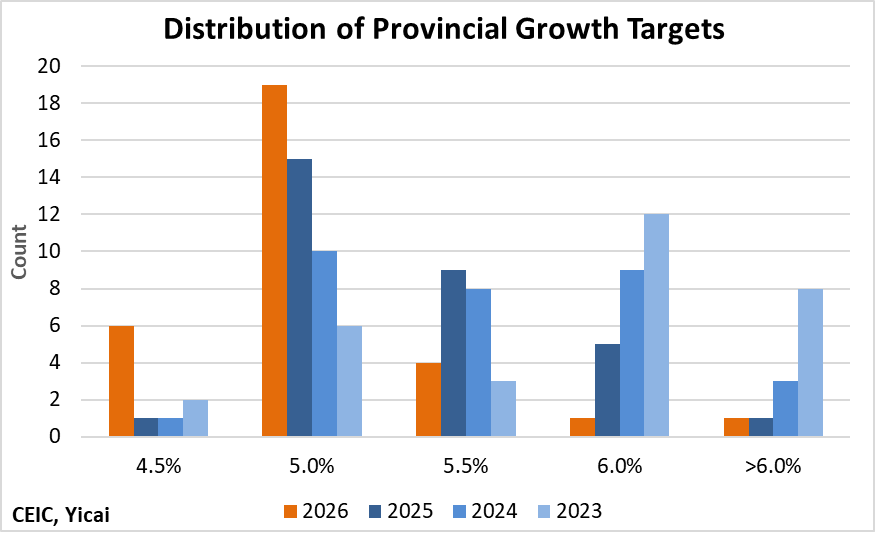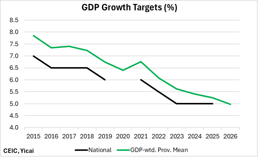 In 2025, the provincial-level GDP-weighted mean was 5.25 percent, compared to the 5 percent national target. This year, the GDP-weighted mean target is 5.0 percent. Recent differences between the provincial-level GDP-weighted mean and the national target suggest that the central government could be looking for growth in the 4.5 to 4.75 percent range.