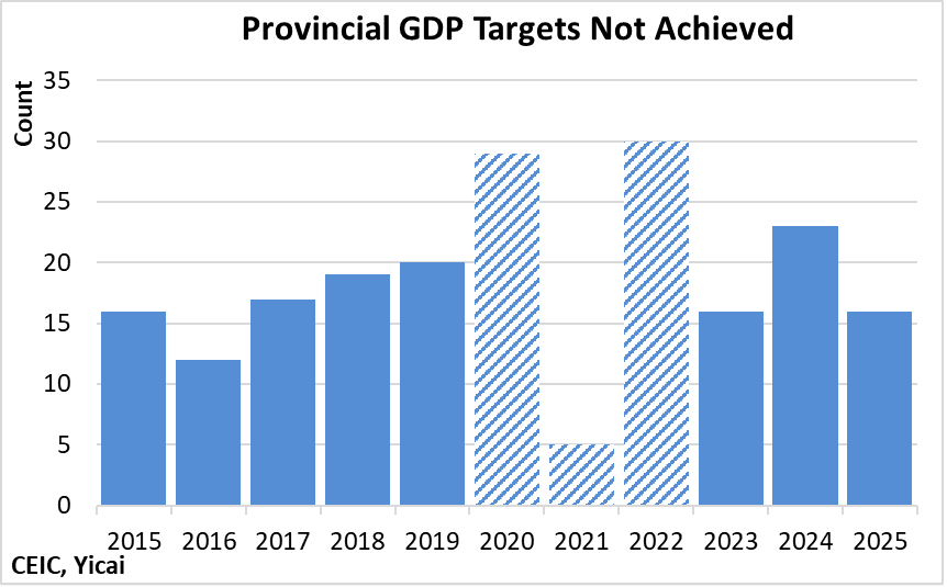 It is important to note that the provincial-level jurisdictions rarely meet their GDP targets. Last year, 16 of the 31 province-level jurisdictions failed to achieve them. Abstracting from the Covid years, this failure rate was not uncommon (Figure 4).