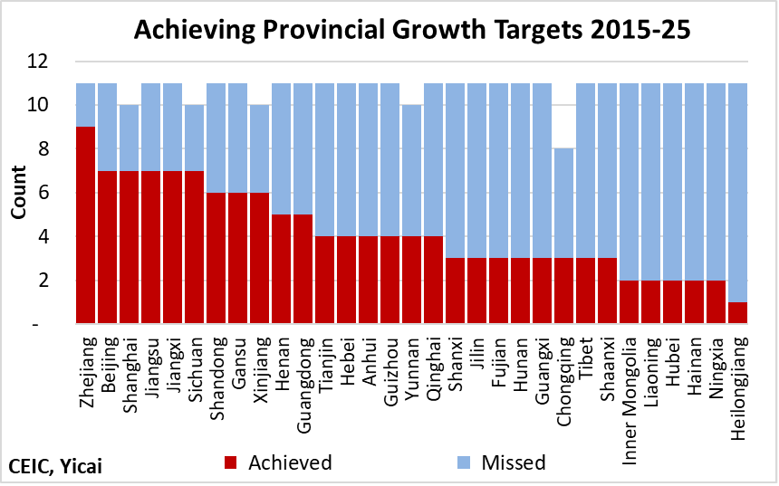 Some provincial-level jurisdictions have been better than others at meeting their GDP targets over the last 10 years (Figure 5). Zhejiang has an 82 percent success rate, while Heilongjiang only met its target once out of the last eleven tries. In general, it seems that richer jurisdictions are more successful than the poorer ones.