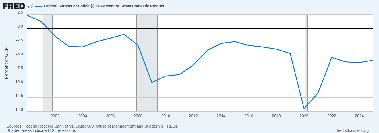 Source: FRED, Federal Surplus or Deficit [-] as Percent of Gross Domestic Product (FYFSGDA188S)