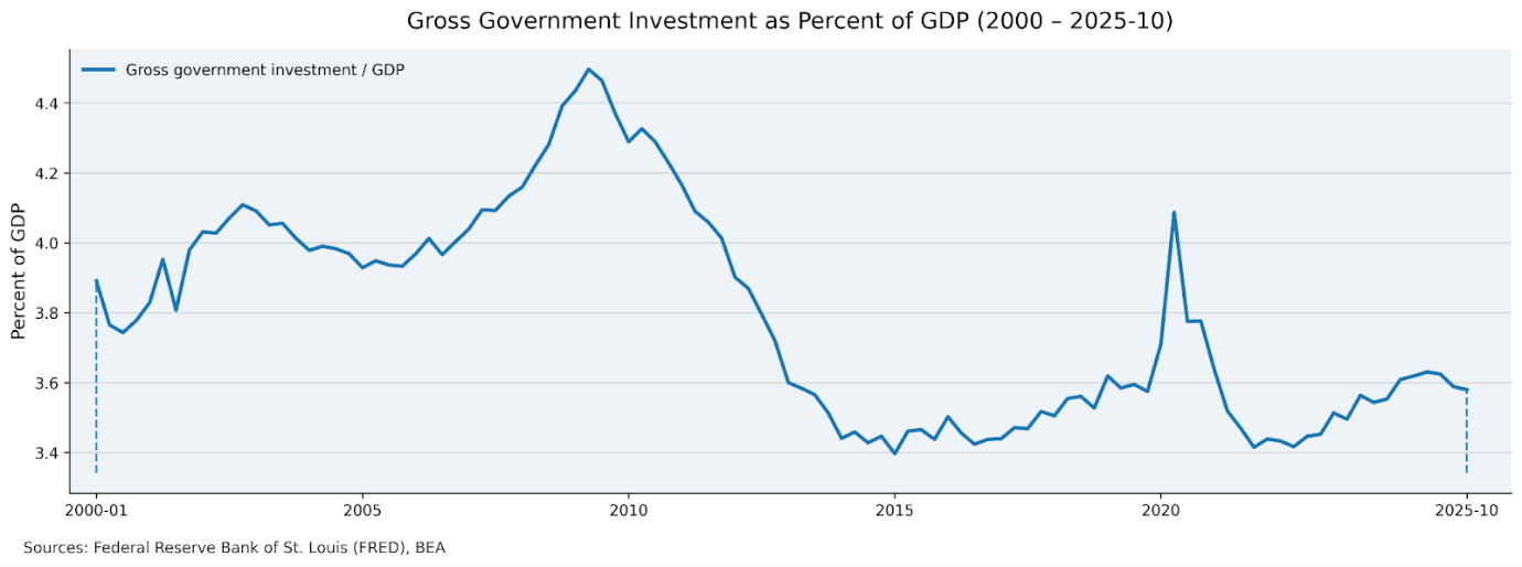 Source: FRED, Gross Government Investment (A782RC1Q027SBEA); FRED, Gross Domestic Product (GDP)