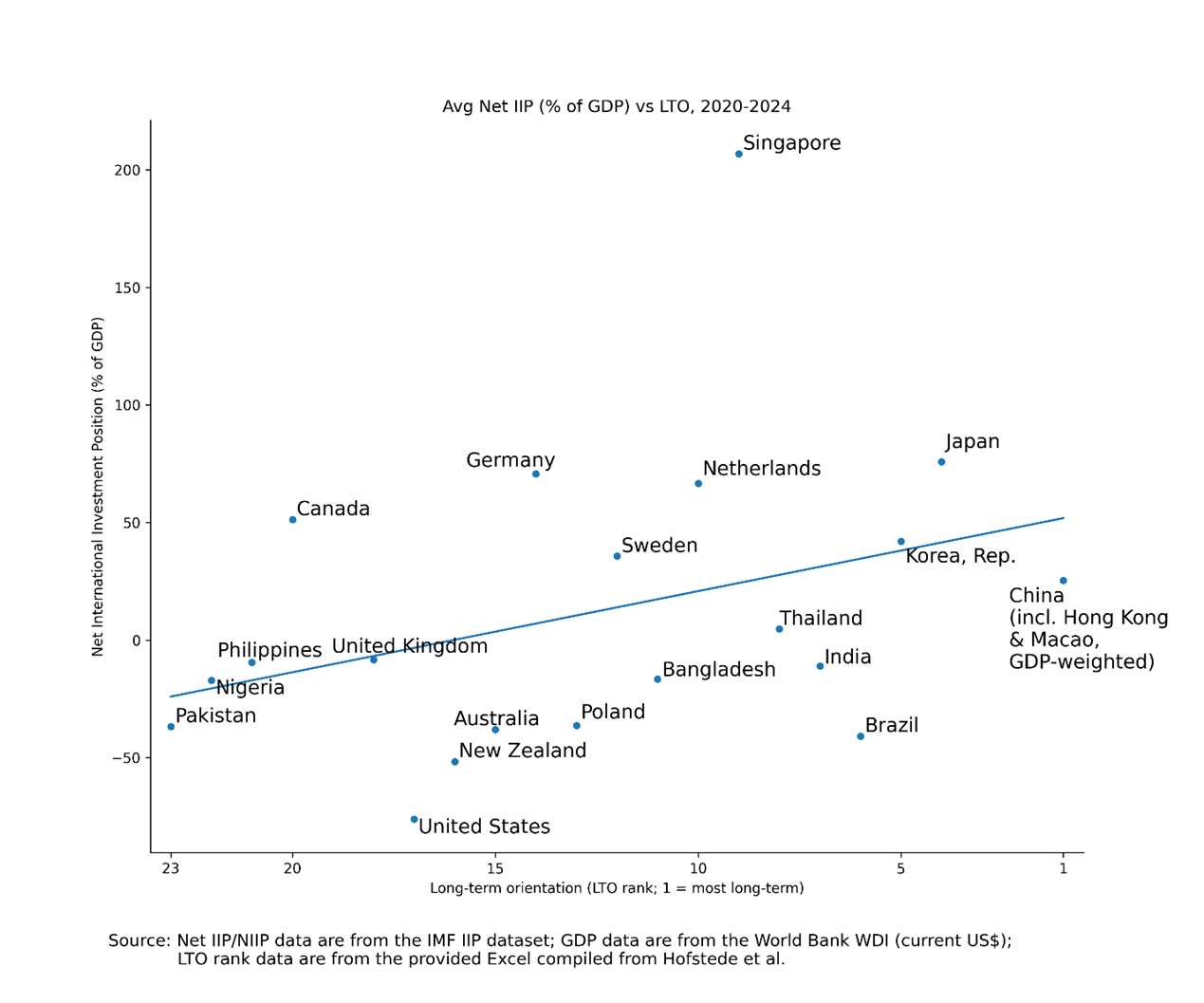 A rough correlation analysis shows that the average NIIP in 2020-2024 is positively associated with the LTO index, as shown in Figure 1. That is, countries with stronger LTO, especially East Asian economies, are more likely to form a stronger net external creditor position. This is consistent with the Growth Commission work (Spence 2008); many of the East Asian economies, including Japan, South Korea, Taiwan, Hong Kong, China, and Singapore, possess similar characteristics of LTO.