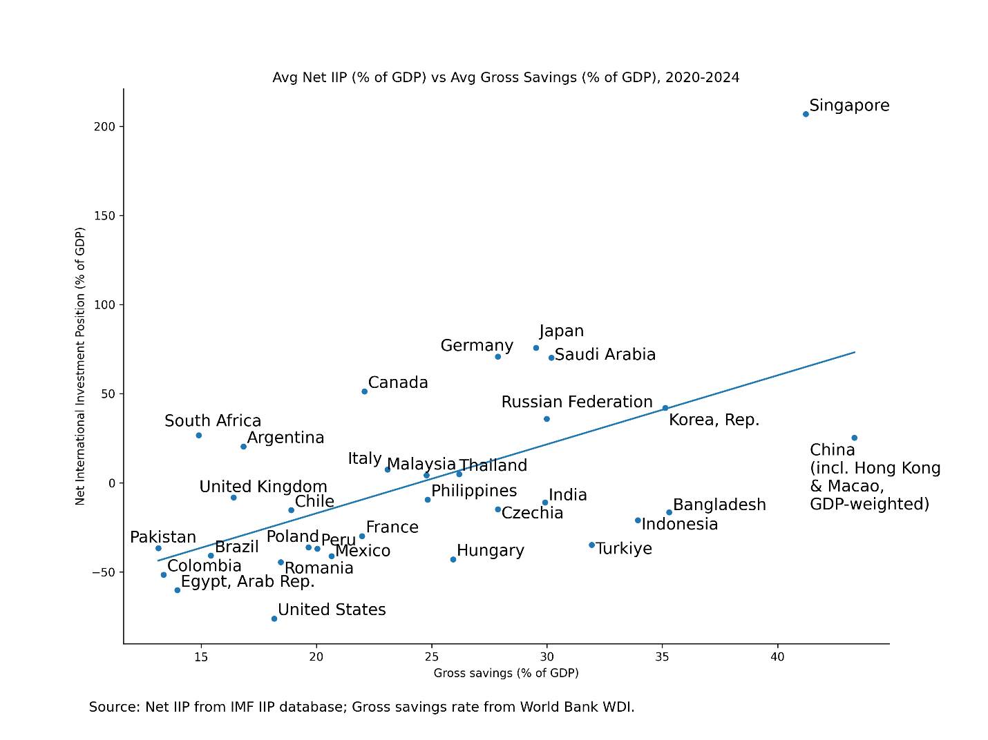 As shown in Figure 2, the 2020-2024 data once again confirm that a high savings rate is highly correlated with a positive NIIP, and this relationship is positive and statistically significant. Although China is still a developing country, it has grown to be a major exporter of capital in recent years.