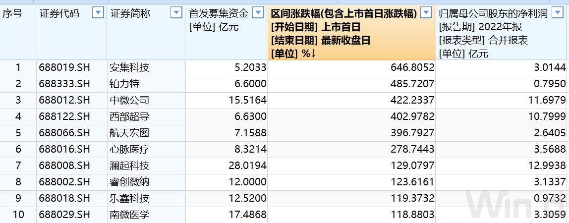 judging from the cumulative stock price increase since the listing (including the first day's increase), 10 of the 25 companies have doubled their stock prices, with anji technology rising the first, reaching 646.8 percent. Platinum (688333.SH), China Micro Company and Western Superconductor all rose more than 400 percent. There are 4 companies that have fallen in total. Xinguang Optoelectronics (688011.SH) has fallen 35% in total, the lowest increase. Tianyi Shangjia, Fangbang (688020.SH) and Fuguang (688010.SH) fell less than 10%.