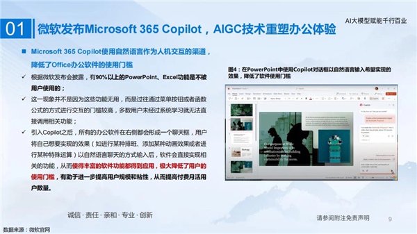 previously, Microsoft launched Microsoft 365 Copilot subscription service, which has been embedded into various office software frequently used by users such as Word, Excel, PowerPoint, Outlook, Teams, etc. natural language is used as a channel for human-computer interaction, lowering the use threshold of Office software, helping users to free themselves from tedious transactional work, allowing users to focus more on creative work, thus improving office efficiency. According to the research paper, Microsoft's Microsoft 365 Copilot subscription service uses AIGC technology to reshape the office experience, bringing revolutionary changes to the user's office model.