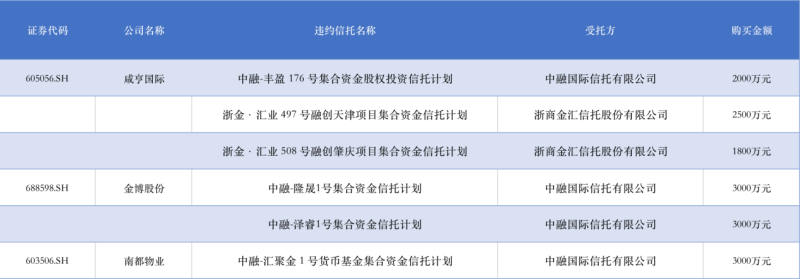 Among the six trust products announced by the three listed companies for overdue payment and default, four are Zhongrong International Trust Co., Ltd. (hereinafter referred to as "Zhongrong Trust") products, and the other two are Zheshang Jinhui Trust Co., Ltd. Trust products. The total purchase amount of the default trust products of the three listed companies is 0.153 billion yuan, all of which are investments of idle own funds.