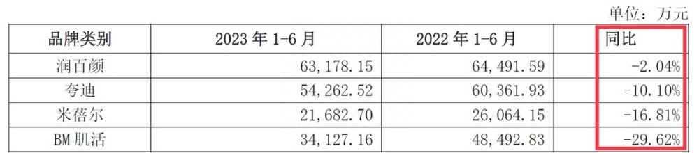 in the first half of the year, Huaxi's bio-functional skin care business achieved revenue of 1.966 billion yuan, down 7.56 percent from the same period last year, and gross profit margin fell 4.35 percent. The income of Run Baiyan, Quadi, Mibel and BM muscle live was 0.632 billion yuan, 0.543 billion yuan, 0.217 billion yuan and 0.341 billion yuan, respectively, corresponding to a year-on-year decrease of 2.04, 10.10, 16.81 and 29.62.