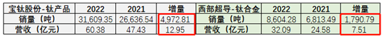 First of all, from the scale point of view, Baoti shares, whether military, or the overall scale, are far more than the western superconducting. Moreover, from 2021 to 2022, sales of titanium products increased by 4972.81 tons, with 1.295 billion revenue growth, while sales of superconducting titanium alloys in the West increased by 1790.79 tons, with 0.751 billion revenue growth.