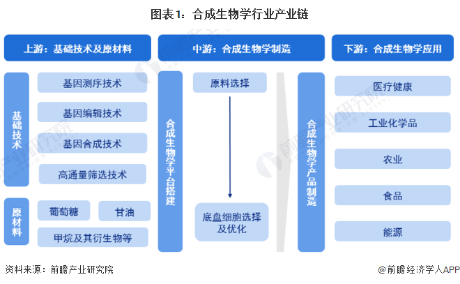 Synthetic biology mainly refers to the use of existing or modified genetic modules to assemble and build a living system that does not exist in nature. Therefore, synthetic biology is an emerging field that is guided by engineering ideas and combined with multiple disciplines. Through a series of redesigns and technologies, organisms or cells are modified to have new capabilities. In this process, a series of new standardized biological components, components and systems are designed and constructed to achieve ideal biological manufacturing capabilities. Its upstream includes basic technology and raw materials, the midstream is synthetic biology manufacturing, including platform construction and product manufacturing, and the downstream is the application field, involving medical, agricultural, industrial, food and other fields.