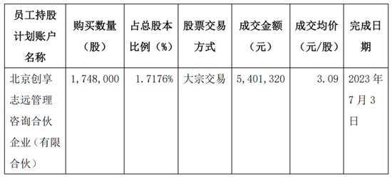 on July 3, 2023, chuangxiangzhiyuan completed the purchase of 1.748 million shares through the block trading platform of the national stock transfer system, with a transaction price of only 3.09 yuan per share and a total price of 5.401 million yuan. Since then, the implementation of the employee shareholding plan has been completed.