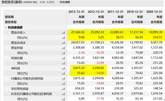 after landing on the new third board, from 2009 to 2011, century oriental's performance has maintained a growth trend, with revenue of 0.11 billion yuan, 0.172 billion yuan and 0.239 billion yuan respectively. But in 2012, its revenue increased by only 5% to 0.251 billion yuan, while its net profit fell 14% to 32.9406 million yuan. The following year, net profit rose, but still not back to 2011 levels.