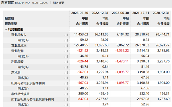 The prospectus shows that from 2020 to 2022 and January to June 2023 (hereinafter referred to as the "reporting period"), Dongfang Zhihui's revenue was 0.284 billion yuan, 0.285 billion yuan, 0.365 billion yuan and 0.115 billion yuan respectively; The net profit to the mother was 17.3769 million yuan, 31.9038 million yuan, 32.2594 million yuan and -5.6703 million yuan respectively.