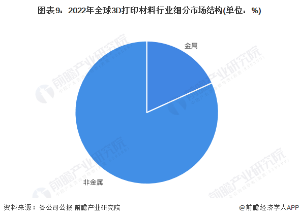 the domestic market segment structure of 3D printing materials is roughly similar to the global structure. according to Wohler's Associates data, non-metallic 3D printing materials will account for more than 80% in 2022, of which polymer materials are the most widely used, accounting for 59% of the market of 3D printing materials.