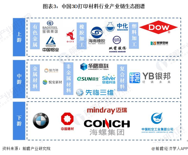 The upper reaches of my country's 3D printing material industry are mainly basic material mining, smelting, and processing enterprises, including non-ferrous metal smelting, rubber processing, plastic processing, etc.; the middle reaches are 3D printing material processing and manufacturing enterprises, which are divided into metal materials, non-metal materials and Three major sectors of composite materials; downstream applications include medical and health, aerospace, building materials, and automobiles.