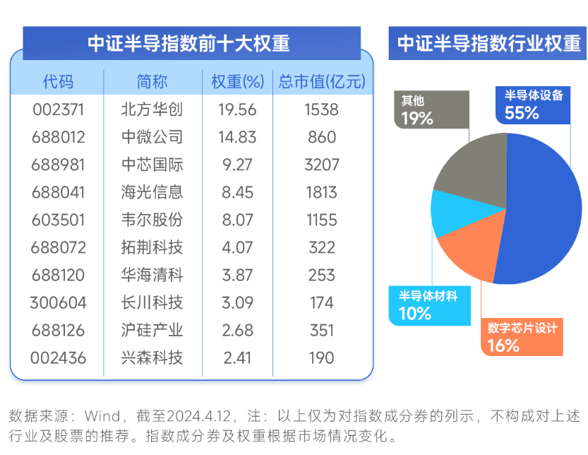 Data show that as of March 29, 2024, the top ten heavyweights in China Securities Semiconductor Industry Index (931865) are North Huachuang (002371), SMIC (688012), SMIC (688981), Haiguang Information (688041), Weir (603501), Tuojing Technology (688072), Huahai Qingke (688120), Changchuan Technology (300604), Shanghai Silicon Industry (688126) and Xinyuan Micro (688037), the top ten weighted stocks together accounted for 76.39 per cent.