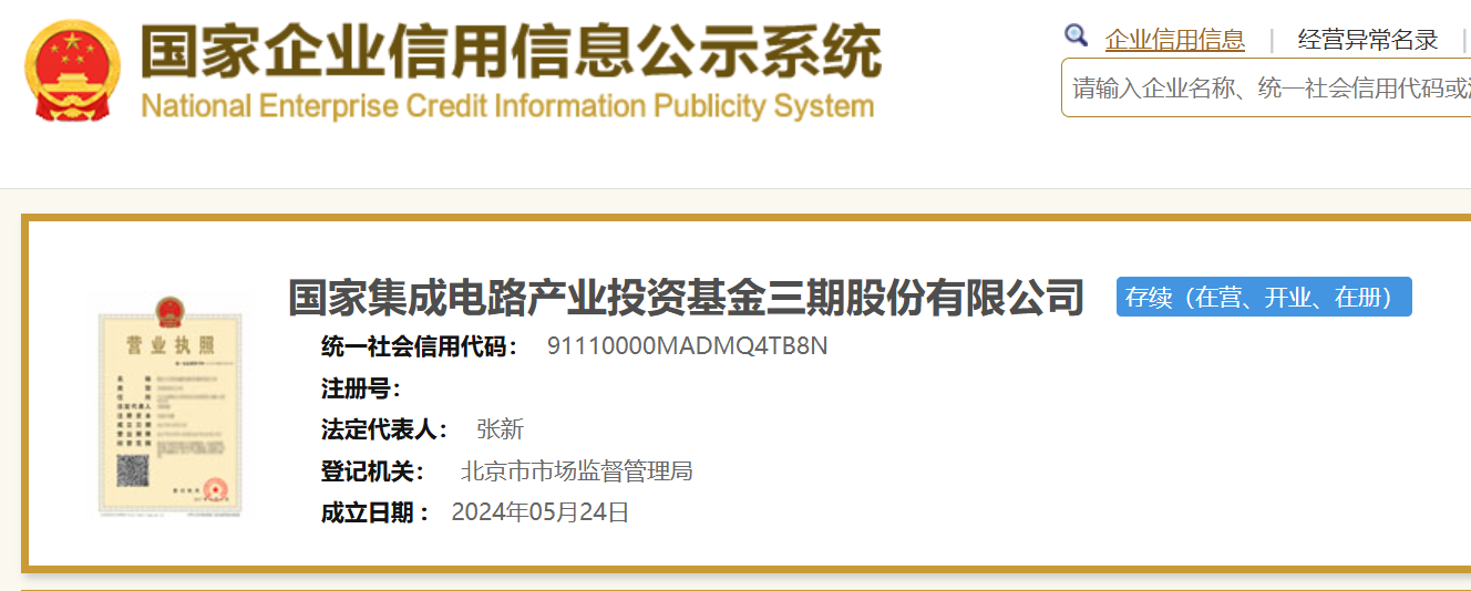 On May 27, according to the National Enterprise Credit Information Publicity System, the National Integrated Circuit Industry Investment Fund Phase III Co., Ltd. (hereinafter referred to as "Big Fund Phase III") was established with a registered capital of 344 billion yuan and the legal representative is Zhang Xin.