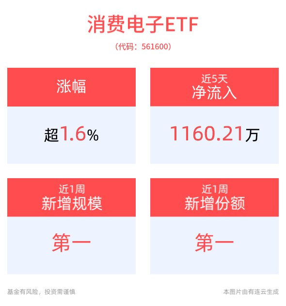 In terms of scale, the scale of consumer electronics ETFs has increased by 7.079 million yuan in the past week, achieving significant growth, and the new scale ranks 1/7 of comparable funds. In terms of shares, the share of consumer electronics ETFs has increased by 11 million shares in the past 1 week, achieving significant growth, and the new shares rank 1/7 of comparable funds. In terms of capital inflow, consumer electronics ETFs have had a net inflow of funds for 3 days in the past 5 trading days, with a total of 11.6021 million yuan and an average daily net inflow of 2.3204 million yuan.
