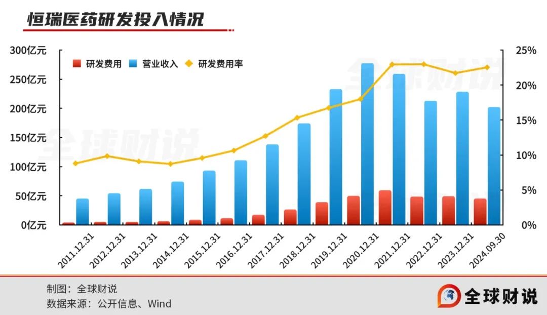 On the other hand, Hengrui Pharmaceutical, since 2011, has been disclosed, and its R&D investment growth has been mainly "stable". While the performance in 2021 declined, R&D investment also decreased slightly. In the first three quarters of 2024, Hengrui Pharmaceutical's R&D expenses were 4.549 billion yuan, and the R&D expense ratio was 22.53%.