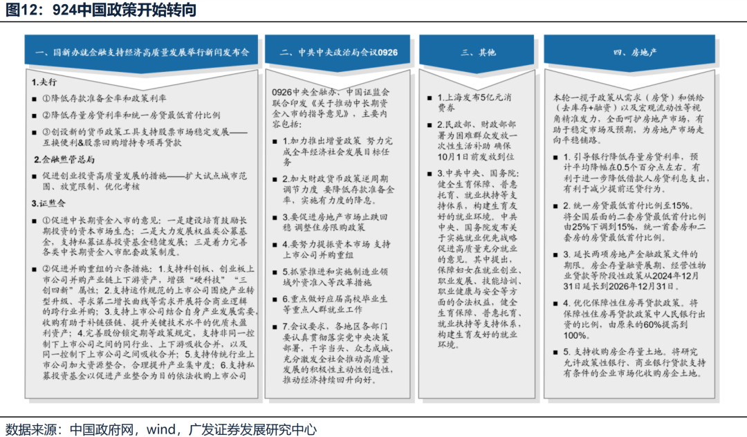 China's policy bottom has appeared: in order to deal with the macro and micro problems caused by the lack of nominal growth rate center, on September 24, a package of incremental policies released a signal to strengthen the counter-cyclical, and on September 26, the Politburo meeting further confirmed the opening of a round of stable growth cycle, followed by the Ministry of Finance, the Ministry of Housing and Urban-Rural Development, etc., have successively issued relevant policies, strengthening the determination and urgency of the top level to stabilize the economy, injecting confidence into the improvement of fundamental expectations, and further boosting market risk appetite, on November 8, the Standing Committee of the National People's Congress adopted the "6+4" debt framework. The "bottom of the policy" is basically confirmed.