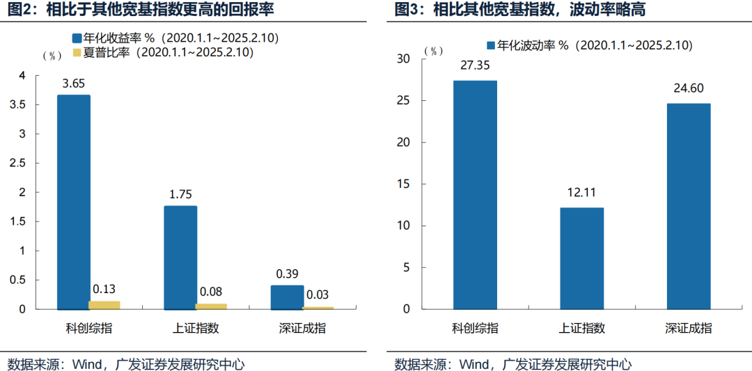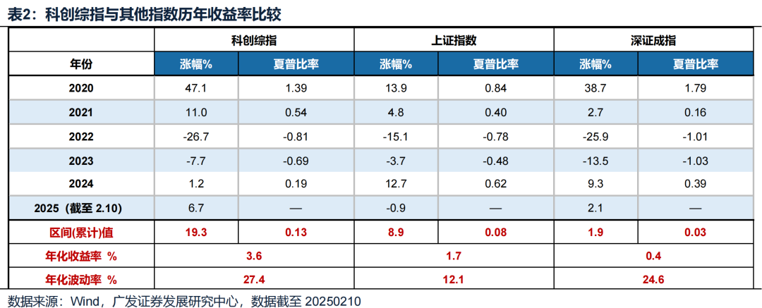 (1) In terms of income, the annualized return of the STAR Composite Index is 3.6%, which is better than other broad-based indices such as the Shanghai Composite Index and the Shenzhen Component Index. The Science and Technology Innovation Composite Index was established on December 31, 2019, and in the time period of January 1, 2020 ~ February 10, 2025, among the mainstream broad-based indexes, the cumulative returns of the Shanghai Composite Index and the Shenzhen Component Index were 8.9% and 1.9% respectively, and the corresponding annualized returns were 1.7% and 0.4% respectively; The cumulative return of the STAR Composite Index is 19.3%, and the corresponding annualized return is 3.6%.