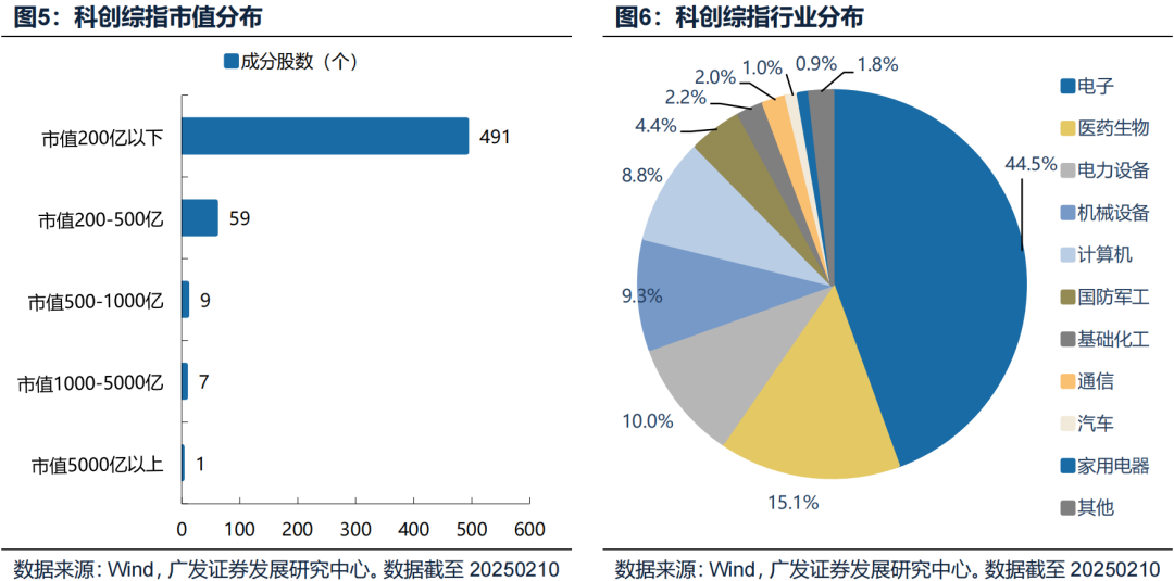 From the perspective of market capitalization distribution, as of February 10, 2025, the average and median total market capitalization of the sample of the STAR Market Composite Index are 13.5 billion yuan and 5.4 billion yuan, respectively, which are basically the same as the whole market of the Science and Technology Innovation Board. The STAR Composite Index includes large, medium and small-cap securities, with a market capitalization coverage of nearly 97%, which can more broadly represent the overall performance of listed companies of different sizes on the STAR Market.