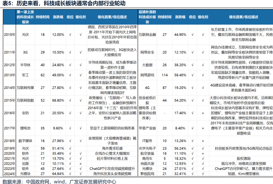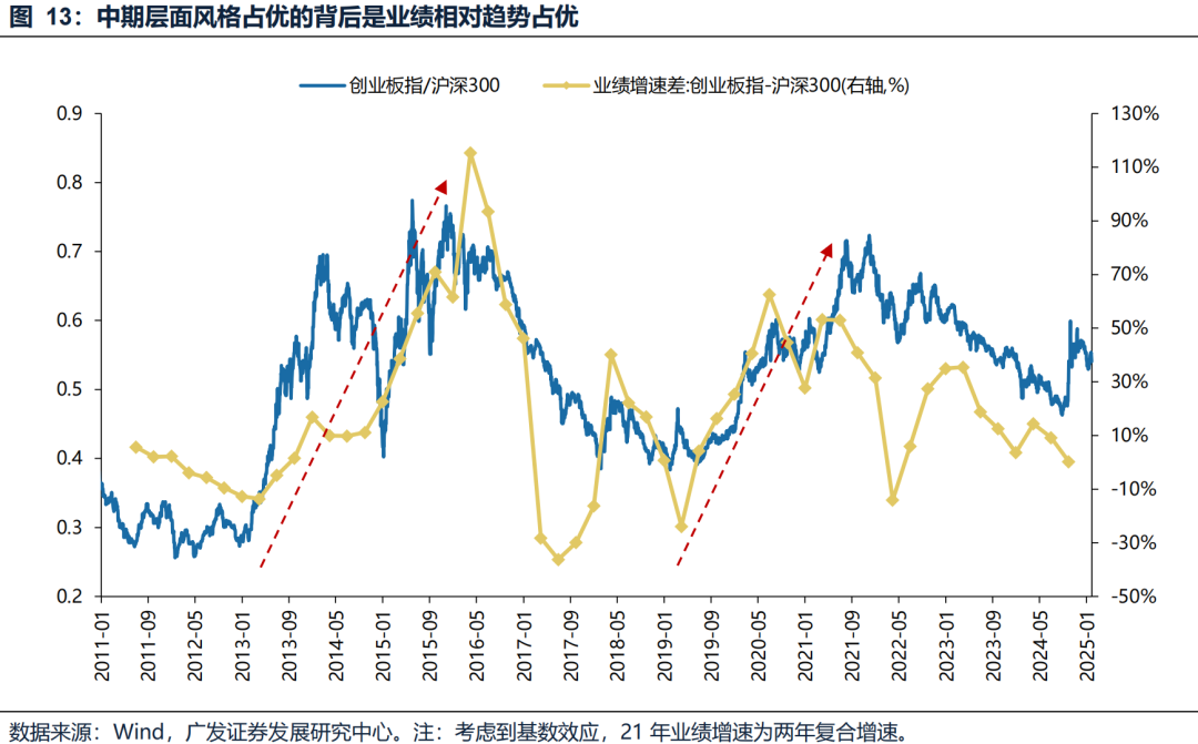 Considering the lack of historical data of the Science and Technology Innovation Board, if the ChiNext index is used to approximate instead of the growth style, and the CSI 300 approximate represents the value style, it can be seen that behind the continuous dominance of the growth style in 13-15 years and 19-21 years, there is a widening gap between the growth direction and the relative advantage of the value direction. Behind the expansion of this relative advantage in performance, there are major changes in the industrial cycle, such as the issuance of 4G licenses in 13 years, the switch from the 3G era to the 4G era, such as the issuance of 5G licenses in 19 years, the switch from the 4G era to the 5G era, the rebound of the global semiconductor cycle, and the acceleration of domestic substitution, such as the delivery of the domestic Model 3 at the end of 19 years, and the 20-year "double carbon goal" proposed. The changes in 2025 may be mainly due to the fact that Deepseek's scientific and technological achievements will bring greater imagination to the vertical downward end and application of AI.