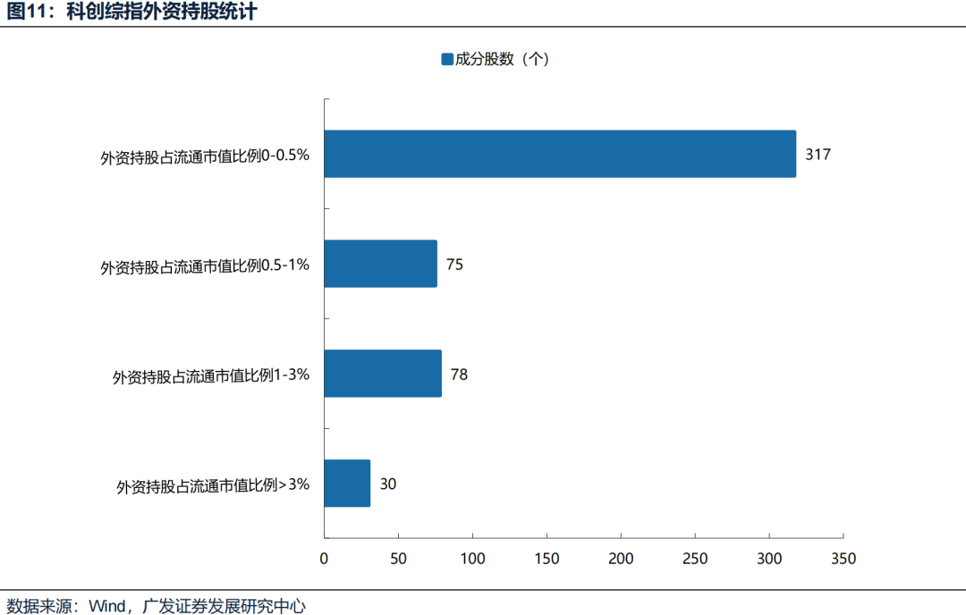 The proportion of foreign ownership of Chinese technology stocks is still low, and there is still a large room for inflow in the future. As an important part of China's capital market, the STAR Market is gradually becoming a hot spot for foreign investment. Among the constituent stocks of the Science and Technology Innovation Board, the number of companies with foreign holdings accounting for 0-0.5% of the circulating market value is the largest, reaching 317, while only 30 companies with foreign holdings accounting for more than 3% of the circulating market capitalization.