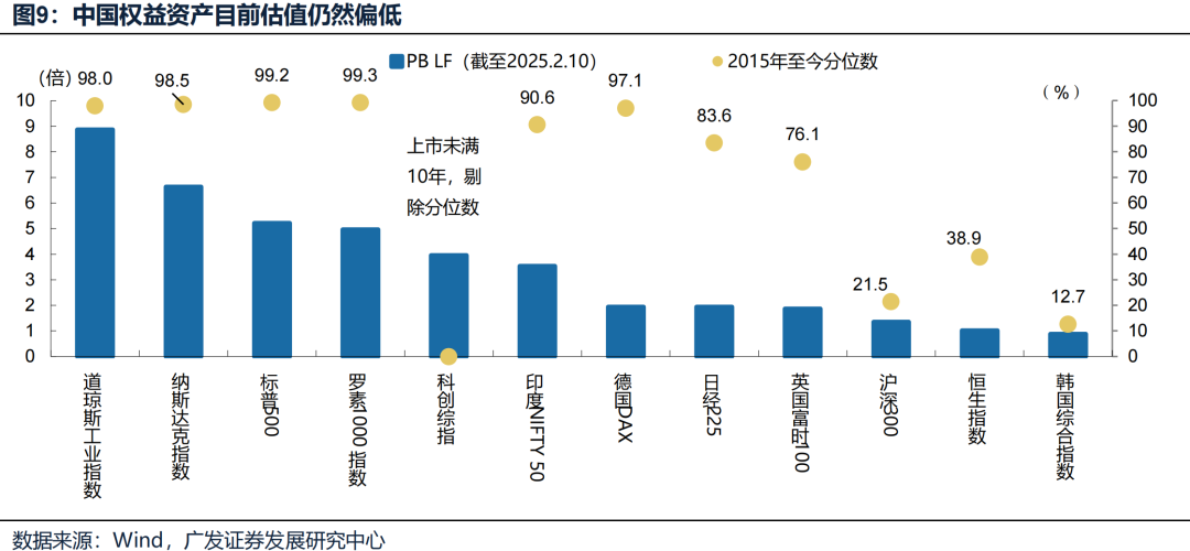 A-share valuations are currently in the middle of the post-historic bottom rally, but are still low compared to the rest of the world. As of February 10, 2025, the PB LF of the CSI 300 is 1.4X, which is at the 21.5% quantile since 2015, and the valuation and quantile of China's assets represented by the CSI 300 are lower than the stock indexes in major overseas markets, and the PB of the Science and Technology Innovation Composite Index, which represents the strongest growth of Chinese assets, is 4.0X, but it is still far lower than the 6.6X of the NASDAQ, and there is still a lot of room for valuation improvement. With the recent volatility of the global stock market and the stability of the RMB exchange rate, the attractiveness of A-shares to global funds has begun to rise, and the attractiveness of the STAR Composite Index is also expected to increase.