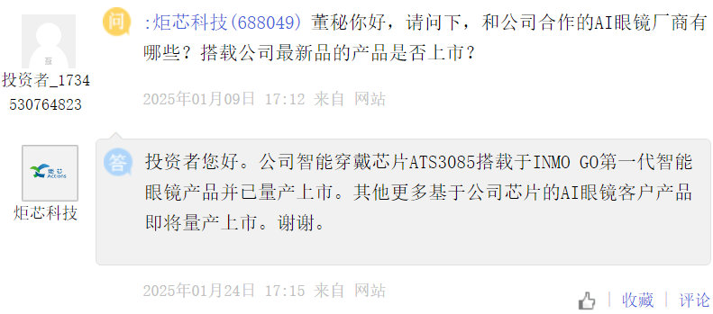 Torch Core Technology [688049]: The company's smart wearable chips ATS3085 installed in the first generation of INMO GO smart glasses products and have been mass-produced and marketed. Other AI glasses customer products based on the company's chips will be mass-produced and launched soon.