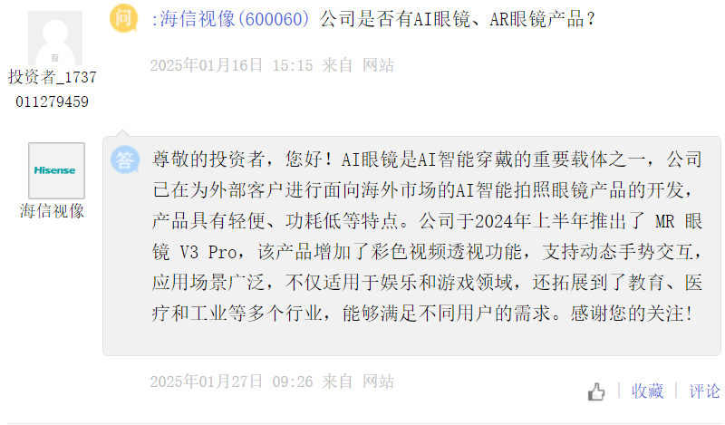 Hisense Video [600060]: AI glasses is one of the important carriers of AI smart wearable, the company has been developing AI smart camera glasses products for overseas markets for external customers, the product has the characteristics of light weight and low power consumption. In the first half of 2024, the company launched the MR Glasses V3 Pro, which adds color video perspective and supports dynamic gesture interaction, with a wide range of application scenarios, not only for entertainment and gaming, but also for education, medical and industrial industries, and other industries, to meet the needs of different users.