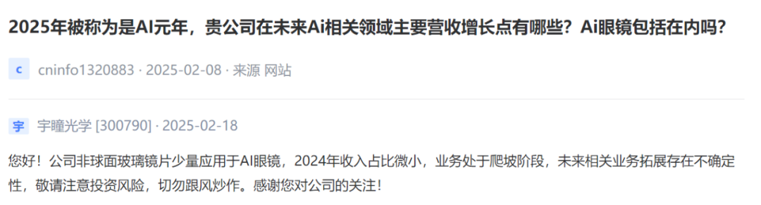 Yutong Optics [300790]: The company's aspherical glass lenses are used in a small amount of AI glasses, the proportion of revenue in 2024 is small, the business is in the climbing stage, and there is uncertainty about the future development of related businesses.