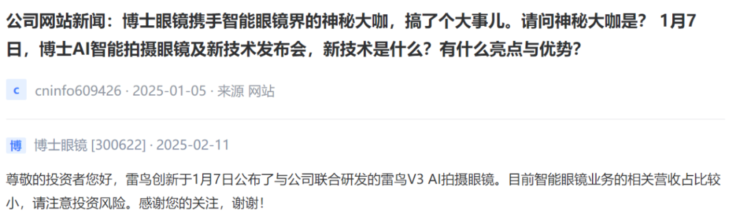 Bose Glasses [300622]: Thunderbird Innovation announced the Thunderbird V3 AI shooting glasses jointly developed with the company on January 7. At present, the revenue related to the smart glasses business accounts for a relatively small amount, please be aware of the investment risk.