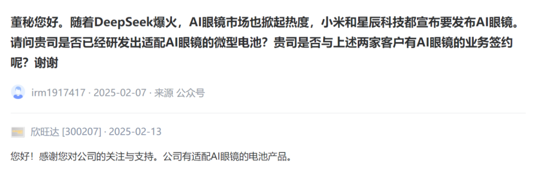 With the explosion of DeepSeek, the AI glasses market has also set off a heat, and Xiaomi and Xingchen Technology have both announced that they will release AI glasses. Has your company developed a miniature battery for AI glasses? Do you have any contracts with the above two customers to have AI glasses business?