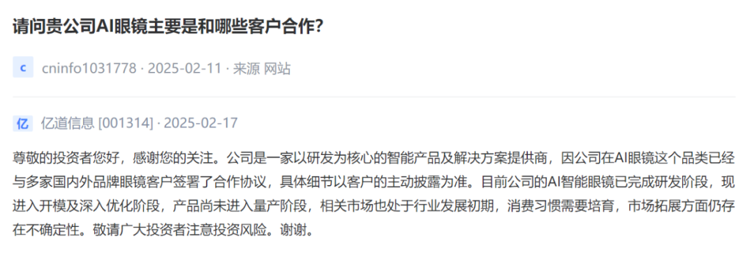 Emdoor Information [001314]: The company is a provider of intelligent products and solutions with R&D as the core, because the company has signed cooperation agreements with a number of domestic and foreign brand glasses customers in the category of AI glasses, and the specific details are subject to the customer's voluntary disclosure. At present, the company's AI smart glasses have completed the research and development stage, and now enter the stage of mold opening and in-depth optimization, the product has not yet entered the mass production stage, the relevant market is also in the early stage of industry development, consumption habits need to be cultivated, and there are still uncertainties in market expansion.