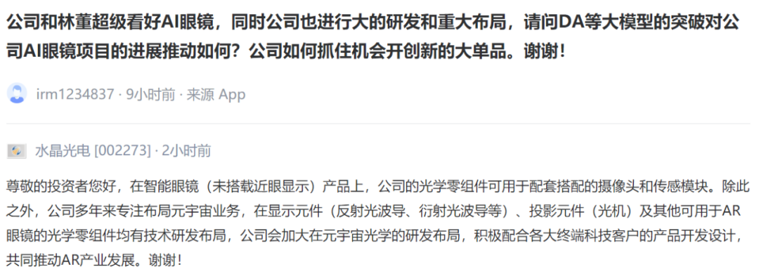 Different from VR glasses, AI glasses focus more on intelligent applications rather than immersive visual experience, and their application scenarios cover multiple fields such as daily life, office, and travel. The core functions of AI glasses include navigation, message reminders, remote meetings, intelligent translation, etc., which are gradually replacing some mobile phone functions, so this field is considered to have broad development prospects. What are the development trends of listed companies in this industry? Panorama selects the most authentic voices from listed companies for you. (The following content is excerpted from Shenzhen Stock Exchange Interactive Easy, SSE e-Interactive, listed company announcements, etc.).