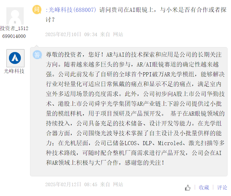 Guangfeng Technology [688007]: With the participation of more and more giants, the certainty of the AR/AI glasses track is getting stronger and stronger. The company previously released the world's first self-developed AR optical module with a PPI of more than 10,000 yuan, which can solve the industry's pain points of lightweight and adaptable to daily wear and insufficient display, and meet the brightness needs of indoor and outdoor multi-applicable scenarios. In addition, the company has initially provided small batches of module prototypes to upstream and downstream companies in the AR industry chain such as Huaqin Technology, an A-share listed company, and Sunny Optical Group, a Hong Kong-listed company, for project pre-research and product pre-development. Based on the continuous investment in the field of AR glasses, the company has sufficient technical reserves, design and development capabilities. In terms of optical combiners, the company has mastered the ability of independent design and small batch sample supply around optical waveguide technology; At the opto-mechanical level, the company has reserved a variety of technical routes such as LCOS, DLP, Microled, laser scanning, etc., which can be used to develop products at any time to meet the needs of machine manufacturers, and the company will actively cooperate with large manufacturers in the field of AI and AR.