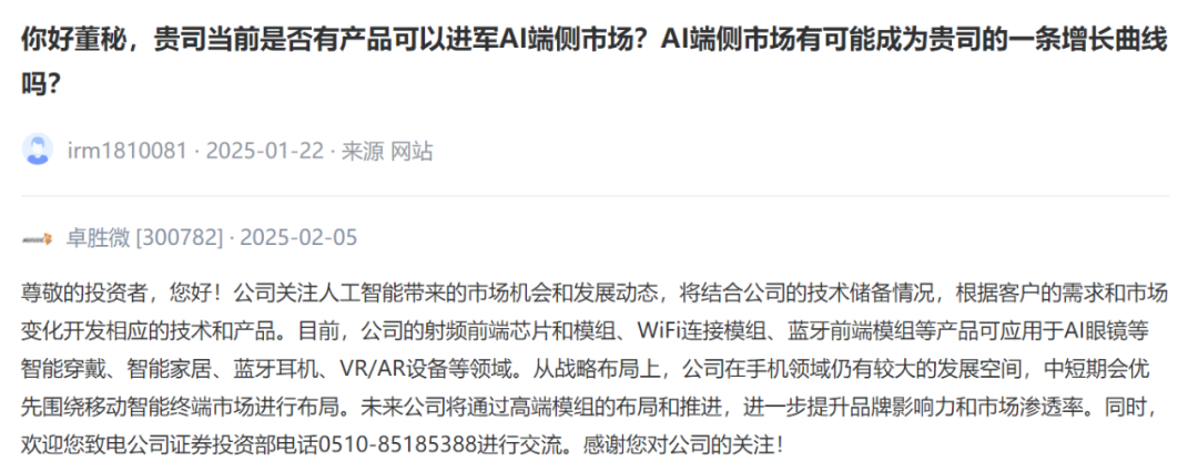 Zhuosheng Micro [300782]: The company pays attention to the market opportunities and development trends brought by artificial intelligence, and will develop corresponding technologies and products according to customer needs and market changes in combination with the company's technical reserves. At present, the company's RF front-end chips and modules, WiFi connection modules, Bluetooth front-end modules and other products can be applied to AI glasses and other smart wearables, smart homes, Bluetooth headsets, VR/AR equipment and other fields. In terms of strategic layout, the company still has a large space for development in the field of mobile phones, and will give priority to the layout of the mobile intelligent terminal market in the short and medium term. In the future, the company will further enhance its brand influence and market penetration through the layout and promotion of high-end modules.