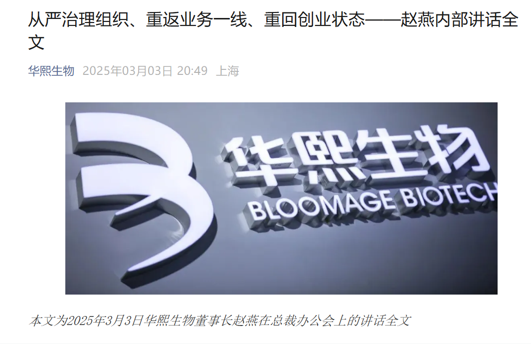 On the evening of March 3, Bloomage Biotech's WeChat public account released the full text of the speech of Zhao Yan, chairman of the company, at the president's office meeting. Among them, her proposal that "all corrupt personnel, regardless of their positions, must explain their problems and submit their resignations within a limited time before March 31" has attracted attention from the outside world.
