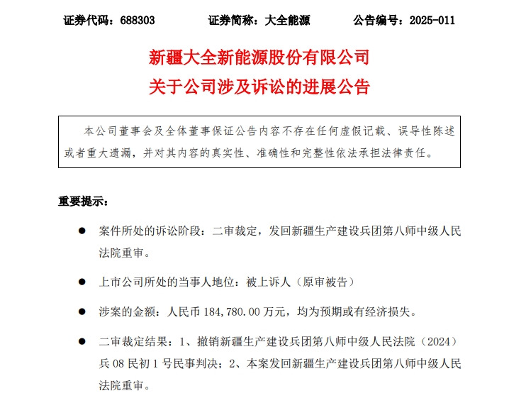 On March 17, Daqo Energy announced the new progress of the litigation case involved in the company, and the current second-instance ruling of the case is to revoke the original judgment and remand for retrial. The company was the appellee in this lawsuit, and the amount involved was 1.848 billion yuan, all of which were expected contingent economic losses.
