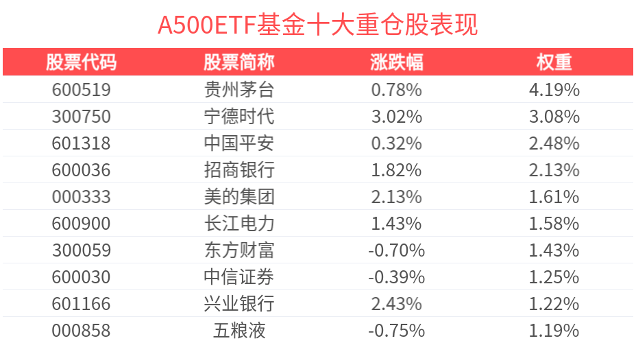 According to the data, as of February 28, 2025, the top ten weighted stocks of the CSI A500 Index (000510) are Kweichow Moutai (600519), CATL (300750), Ping An of China (601318), China Merchants Bank (600036), Midea Group (000333), Yangtze River Power (600900), BYD (002594), Industrial Bank (601166), Oriental Wealth (300059), and CITIC Securities(600030), the top ten weighted stocks accounted for 20.3%.