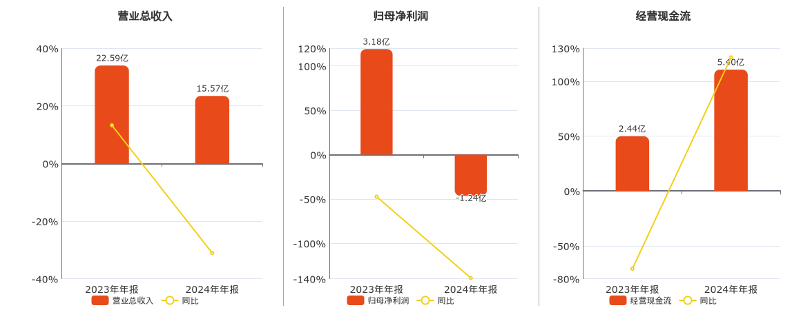 The company's total operating income was 1.557 billion yuan, a decrease of 702 million yuan from the total operating income of the same period last year, and a decrease of 31.07% compared with the same period last year. The net profit attributable to the parent company was -124 million yuan, a decrease of 442 million yuan from the net profit attributable to the parent company in the same reporting period last year, and a decrease of 139.12% compared with the same period last year. The net cash inflow from operating activities was 540 million yuan, an increase of 296 million yuan over the net cash inflow of operating activities in the same reporting period last year, and an increase of 121.67% over the same period last year.